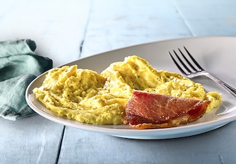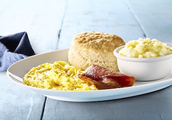 4 strips of griddle-cooked bacon; 4 eggs; a scratch-made, fresh-baked biscuit served hot with butter; and a side of your choice.