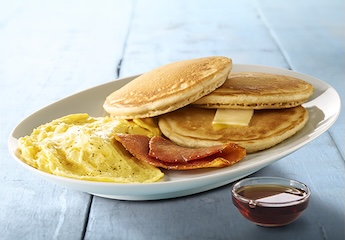 3 griddle-cooked buttermilk pancakes, 2 eggs, and 2 strips of griddle-cooked bacon.