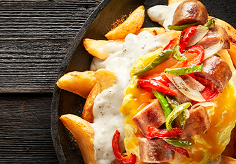 Our creamy Sausage Gravy poured generously over our crispy Country Fries, topped with scrambled eggs, shredded cheddar cheese, and our split, griddle-cooked smoked sausage links from Tennessee, piled high with fire-roasted peppers and onions.