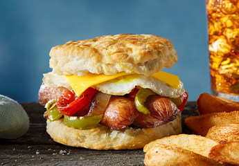 Savory, griddle-cooked smoked sausage (split in half) from Tennessee, piled high with fire-roasted peppers and onions, your choice of egg, and melted American cheese, served on a scratch-made, fresh-baked biscuit.